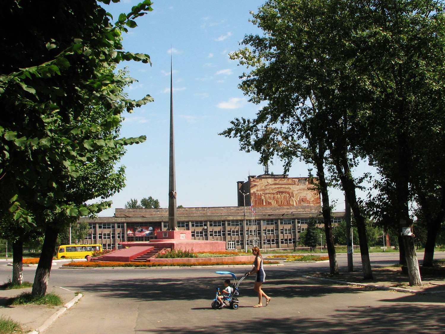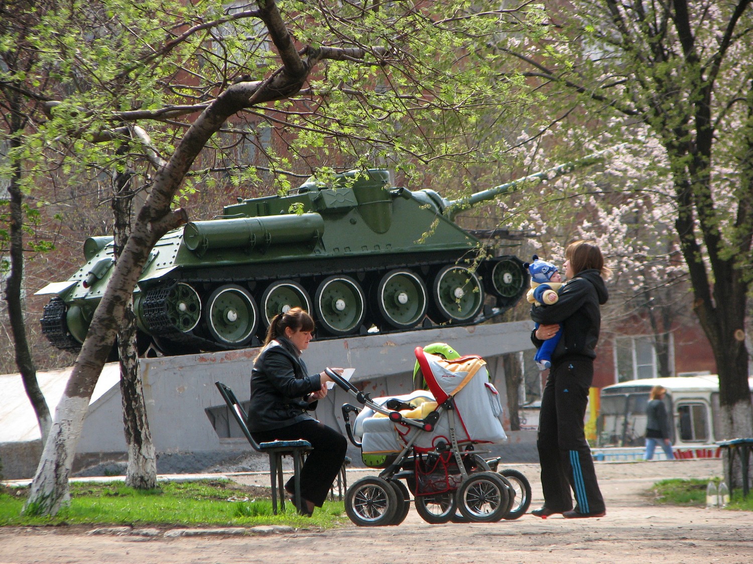 Памятный знак в честь советских воинов – артиллеристов, самоходчиков открыт в честь 30-летия Победы в Великой Отечественной войне. Установка создана на базе знаменитого танка Т-34. Проект постамента разработан преподавателями кафедры архитектуры Коммунарского горно-металлургического института А. С. Москалевым и В. Г. Поневежей.