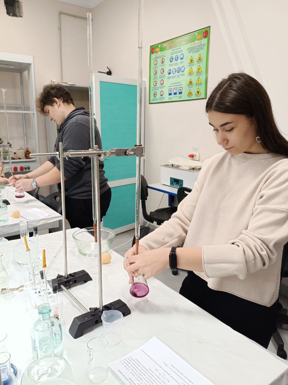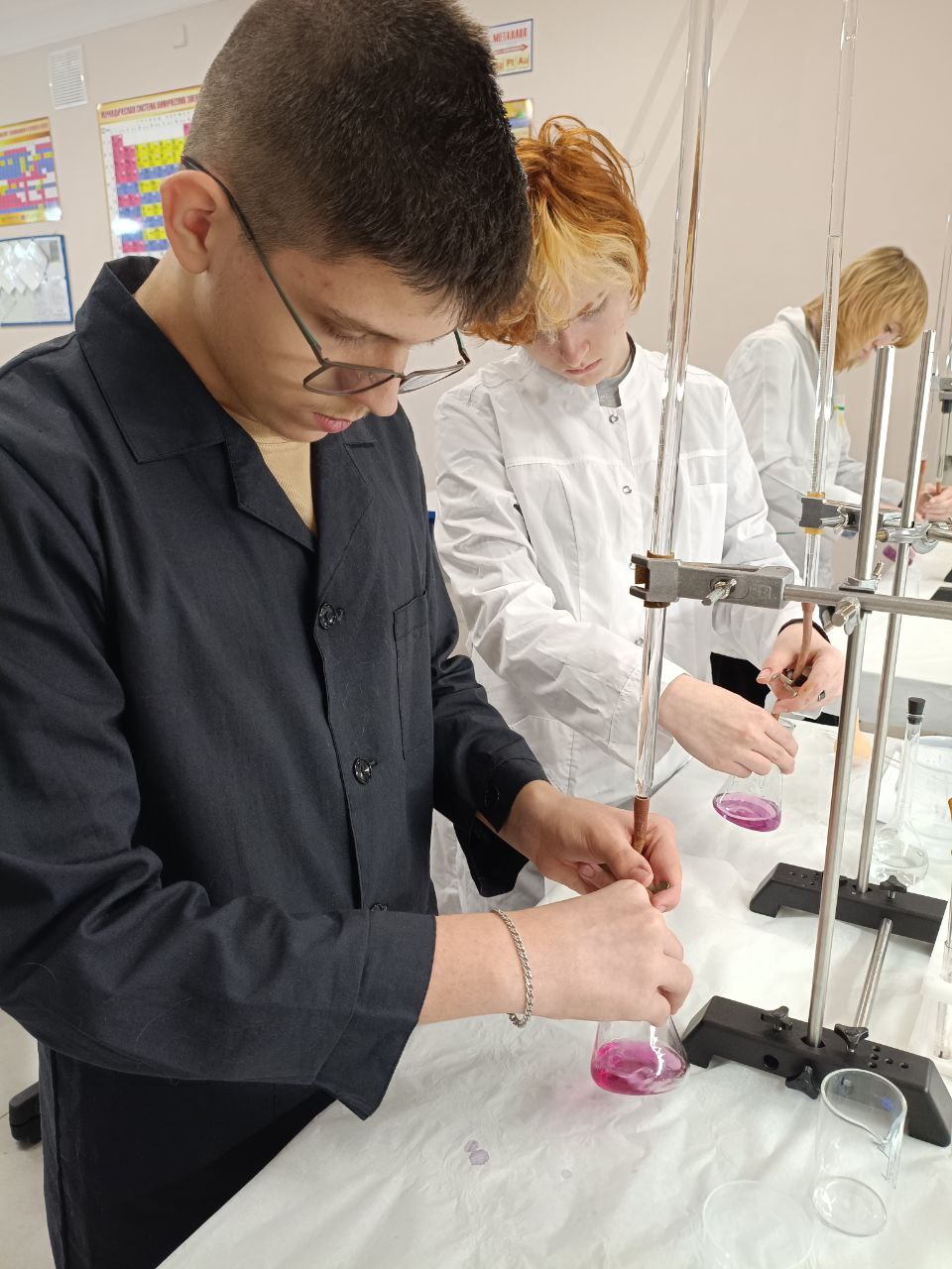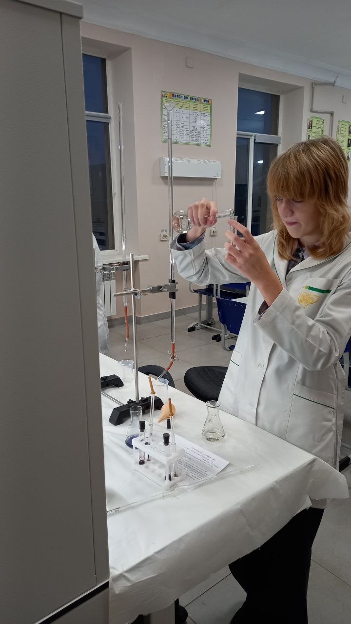 Основной частью занятия стал химический эксперимент. Разбившись на группы, учащиеся провели титриметрический анализ образцов воды с помощью комплексона III (Трилона Б). Цель – определить общую жесткость в нескольких пробах: