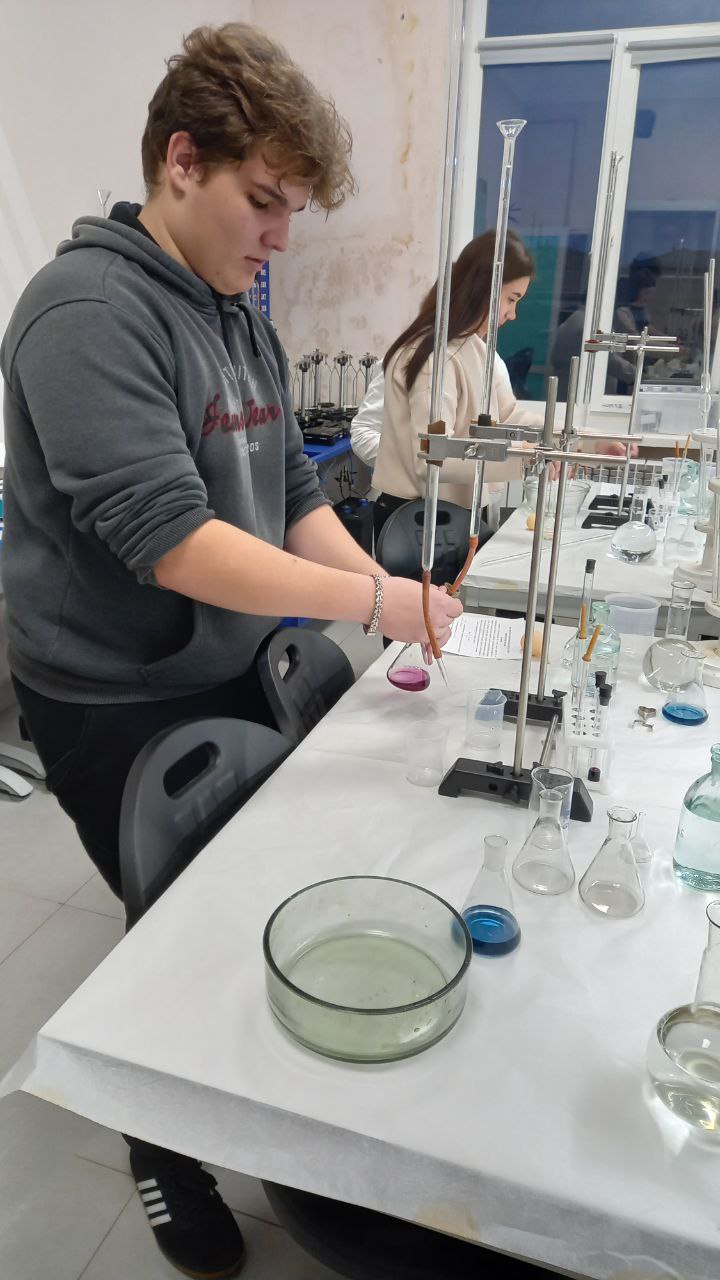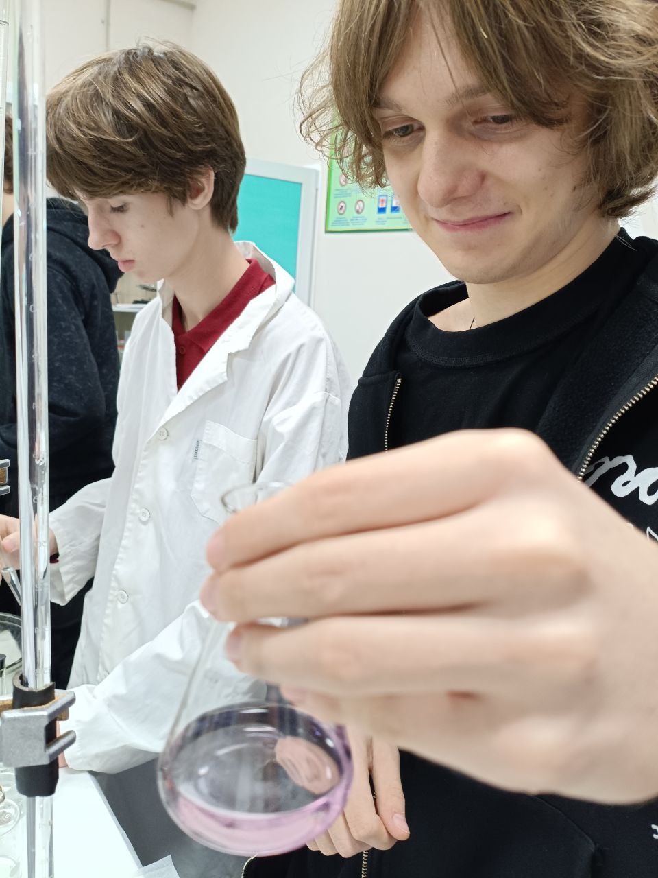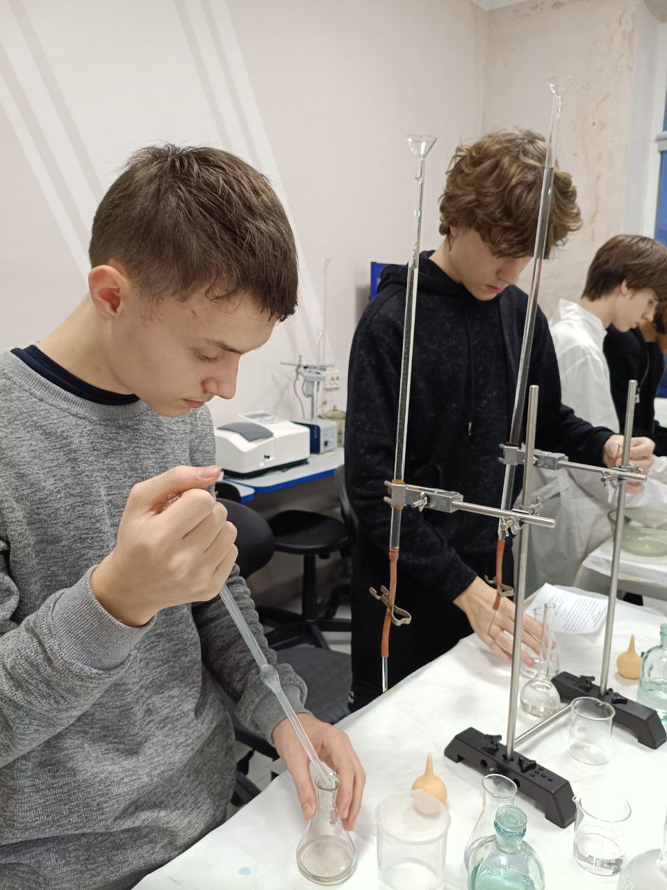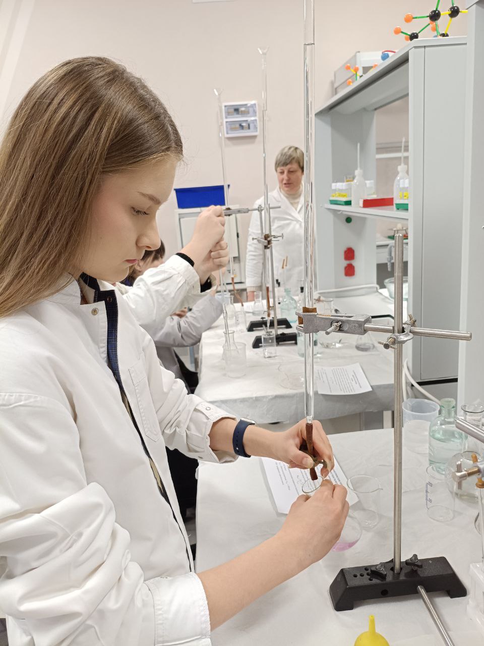 Основной частью занятия стал химический эксперимент. Разбившись на группы, учащиеся провели титриметрический анализ образцов воды с помощью комплексона III (Трилона Б). Цель – определить общую жесткость в нескольких пробах: